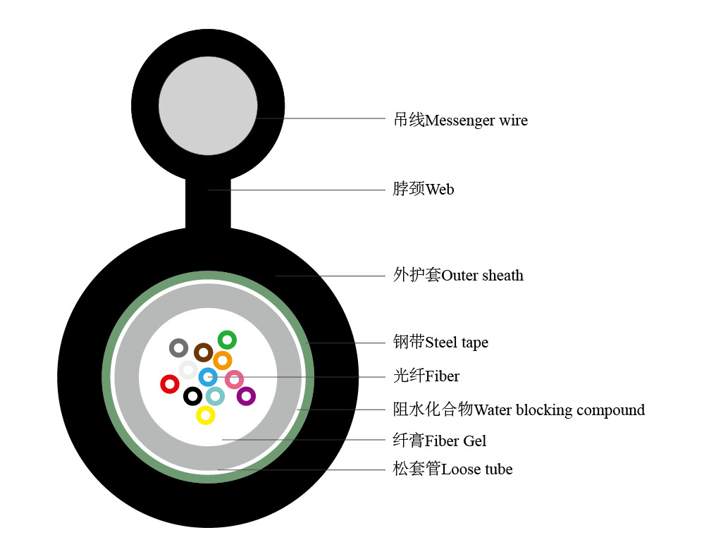 De structuur ervan combineertcentrale losse buis gevuld met gel,van de soort gebruikt voor de vervaardiging van motorvoertuigen, en eenafzonderlijke boodschapperdraad ofwel eengegalvaniseerde staalstrengenof eenenkelvoudige staaldraad- een sterk en betrouwbaar 8-vormig profiel vormen, ideaal voor polen-tot-polen-spanningen.
